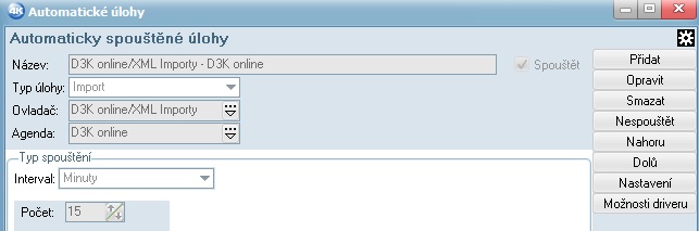 2. V úloze „Automatické úlohy“ nastavit úlohu „D4K online/XML Importy – D4K online“, čas spouštění nastavit dle potřeby